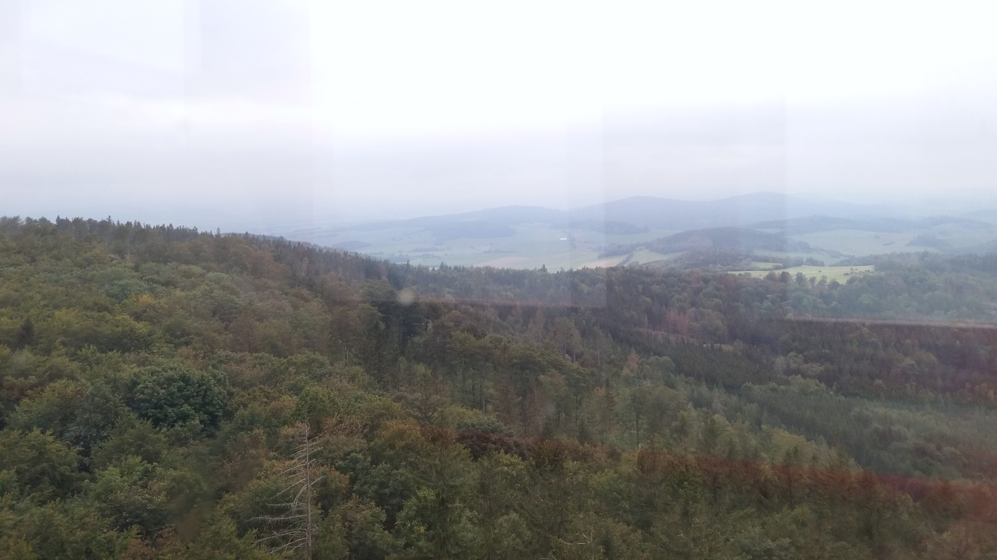 První tip z informačních letáků je rozhledna Koráb, která je dá se říct přímo nad kempem, kde jsme byli. Autem se dalo zajet až přímo k rozhledně, v horské boudě jsme si dali teplé espreso a čaj a dostali klíče od rozhledny. Pak už zbývalo jen vystoupat 144 schodů do místnosti, která nebyla standardně kulatá, jak by se od rozhledny očekávalo, ale trojúhelníkového tvaru, kde jsme si připadali jako ve vesmírné lodi. Odtud asi název Koráb. Rozhledna a horská bouda Koráb (773 m n/m.) je součástí české jižní větve Svatojakubské poutní cesty do Santiaga de Compostela. Takže kdyby byl zájem, tak odsud to je do cíle ještě 2836 km.