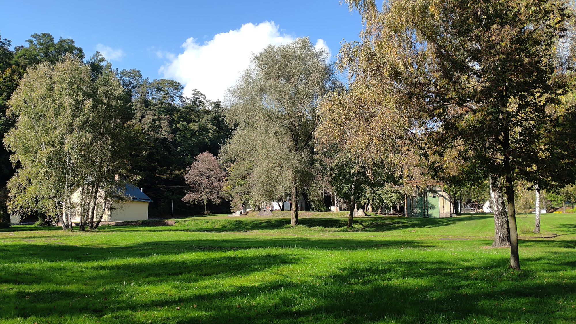 Dobrá tedy, odpoledne přijíždíme do Bludova u Šumperka na první místo, kde strávíme zbytek tohoto a další dva celé dny. Pozemek zabukovaný přes službu Bezkempu je součástí místního koupaliště na klidném místě za provozní budovou. Majitel / správce pozemku naprosto v pohodě, hned nám dává první instrukce kde, co a jak. Elektřinu nepotřebujeme a v rohu pozemku je kohoutek s pitnou vodou. Jediné, co zde chybí je výlevka, ale to má čas.