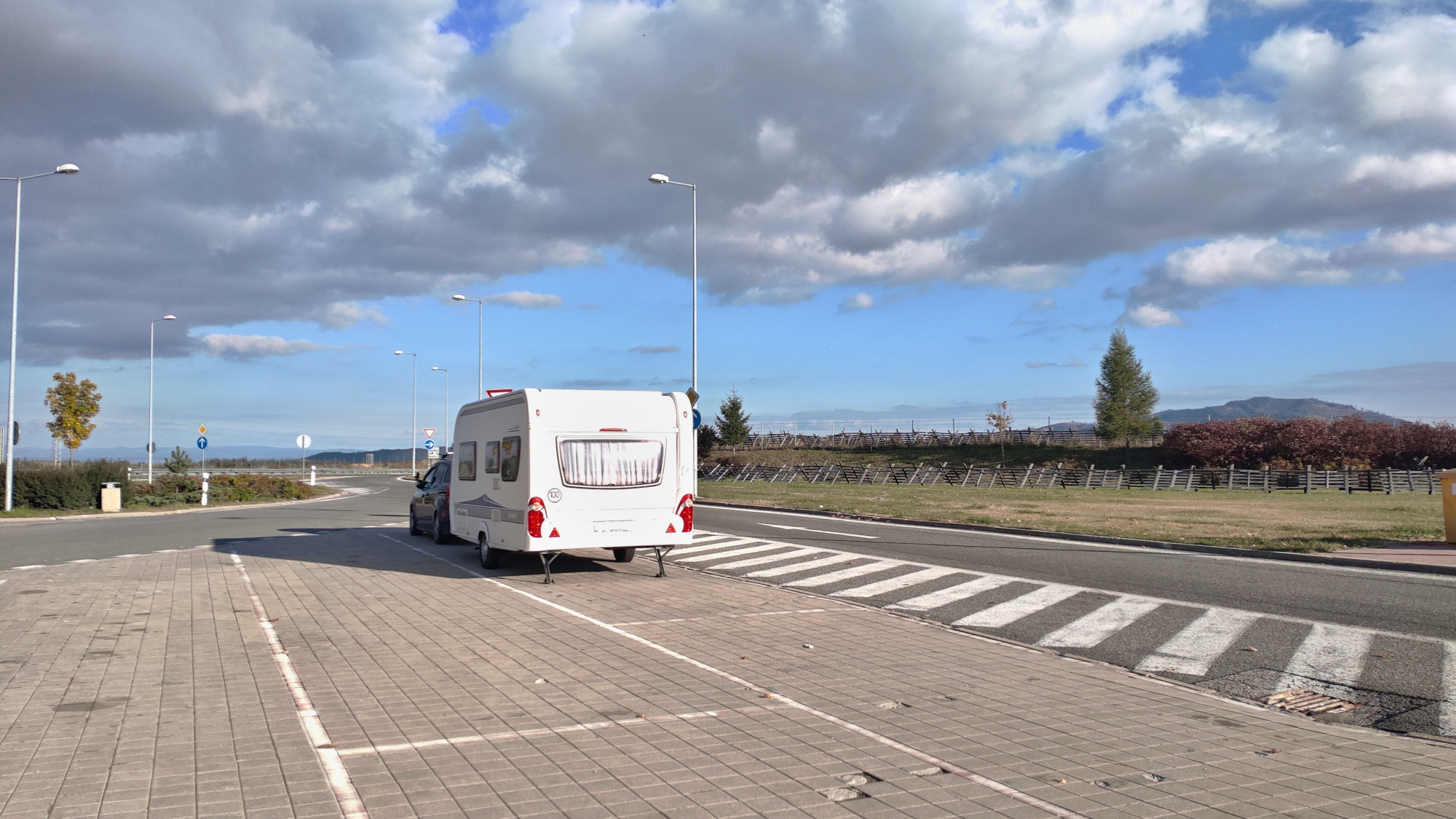Strohý zápis v palubním deníku říká, že jsme odjížděli v sobotu, 9. října a cesta byla bez problémů až na místo určení. Jinými slovy: protože s námi jel i jeden pes a jeden kocour, byla první zastávka už u čerpací stanice v Hradci Králové. Doplnit palivo, obsloužit zvířata, a nakonec i sebe. Dáváme si dobrou kávu a pokračujeme dál, směr Mohelnice. Z Hradce Králové volíme pro nás, karavanovou soupravu lepší variantu po silnici I/35 a kolem 14h dorážíme k motorestu Studená Loučka. Motorest leží na vrcholu „Mohelničáku“, což je v nákladní dopravě velmi proslulé silniční stoupání, které je zejména od Mohelnice obávaným místem zimního nechtěného zdržení kamionů. Samotný motorest, který znám z konce 90 let 20 a prvních let 21 století se téměř vůbec nezměnil, jen na dvoře je o 20 let vyšší strom.